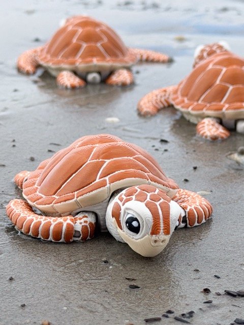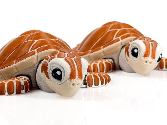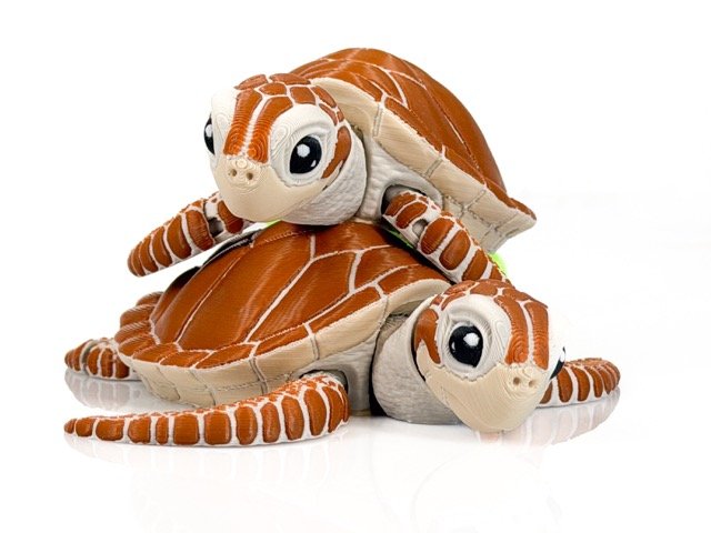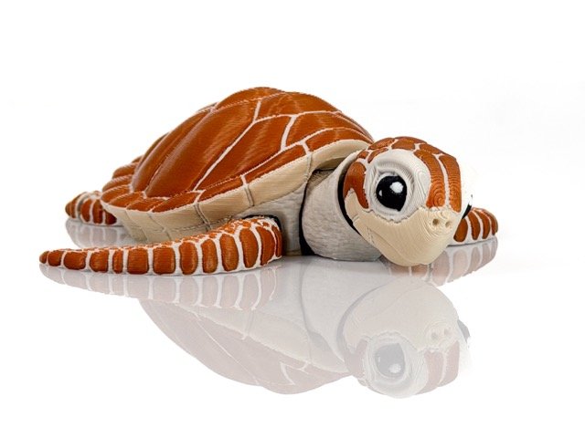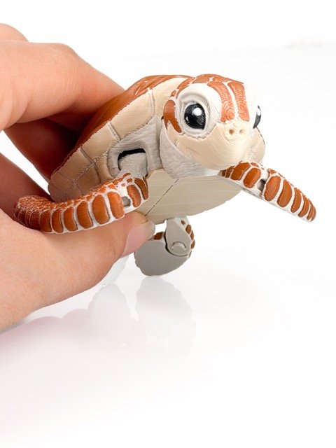 Šis jūras bruņurupucis izceļas ar dabisku formu un izteiktām detaļām — segmentēts bruņu raksts, lielas, izteiksmīgas acis un plūstošas spuras, kas kustībā rada “peldēšanas” efektu.