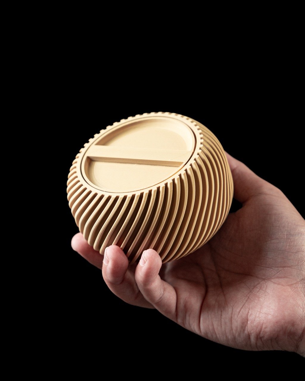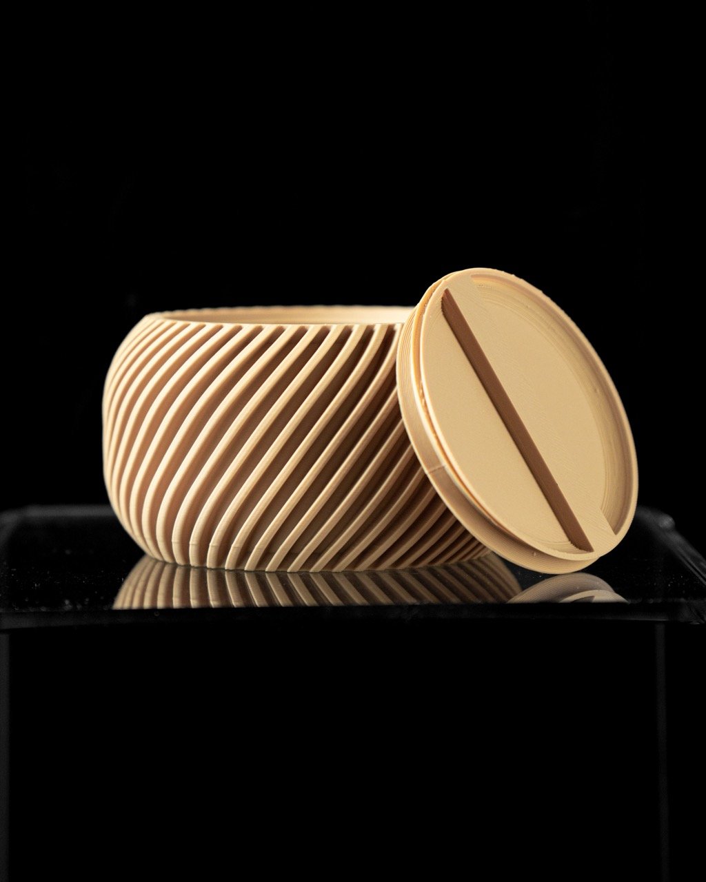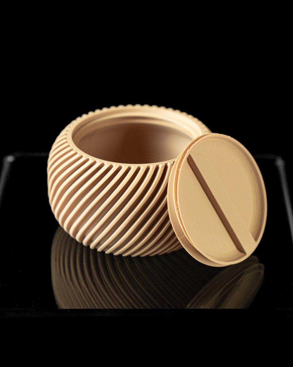 Šis mazais konteinerītis ir kompakts, bet pārdomāts aksesuārs ikdienai. Tā noapaļotā forma ar spirālveida rievām rada patīkamu vizuālo un taustes pieredzi. Cieši pieguļošais vāciņš pasargā saturu, bet izmērs padara to ideāli piemērotu sīklietām – rotaslietām, medikamentiem, tējai, USB zibatmiņām vai pat bērna pirmajam zobiņam.