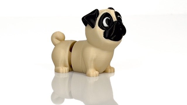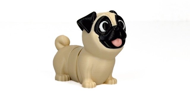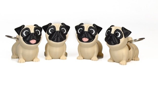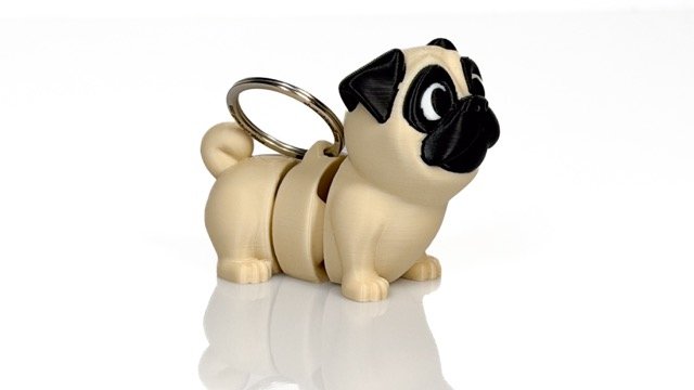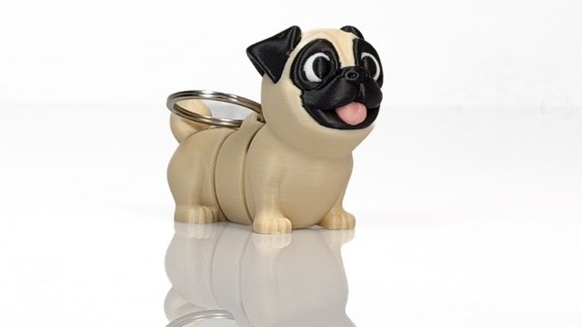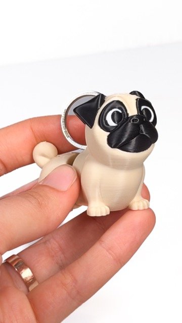Figūriņa veidota mopša formā — šķirnei raksturīgs plakans purniņš, lielas acis un kontrastējoša tumšā maska. Detalizētais dizains padara to vizuāli izteiksmīgu un viegli atpazīstamu.